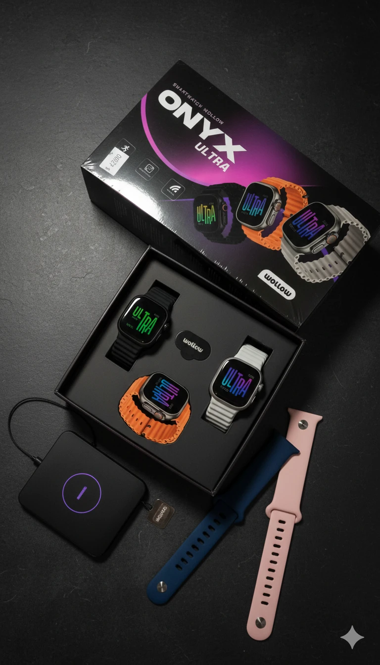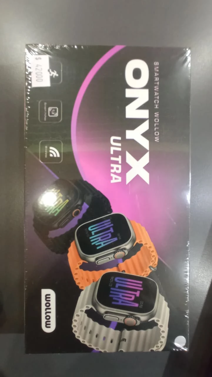 El Smartwatch Wollow Onyx Ultra Black es un reloj inteligente deportivo con una pantalla táctil LCD IPS de 2.2 pulgadas, conectividad Bluetooth y un diseño negro con malla de silicona. Entre sus características se incluyen GPS integrado, capacidad para descargar aplicaciones, reproducción de audio, duración de batería de hasta 4 días con carga rápida, protección IP68 (resistencia al agua hasta 1 metro) y sensores de podómetro