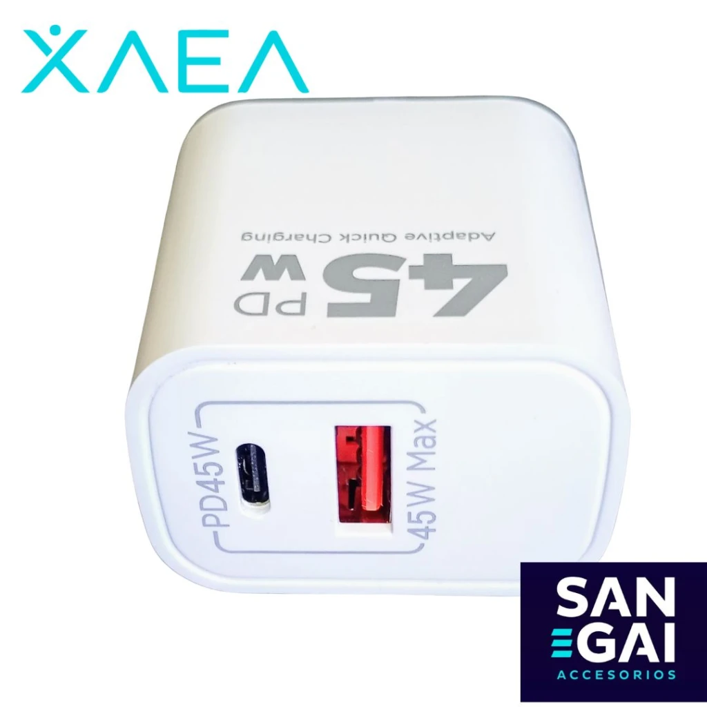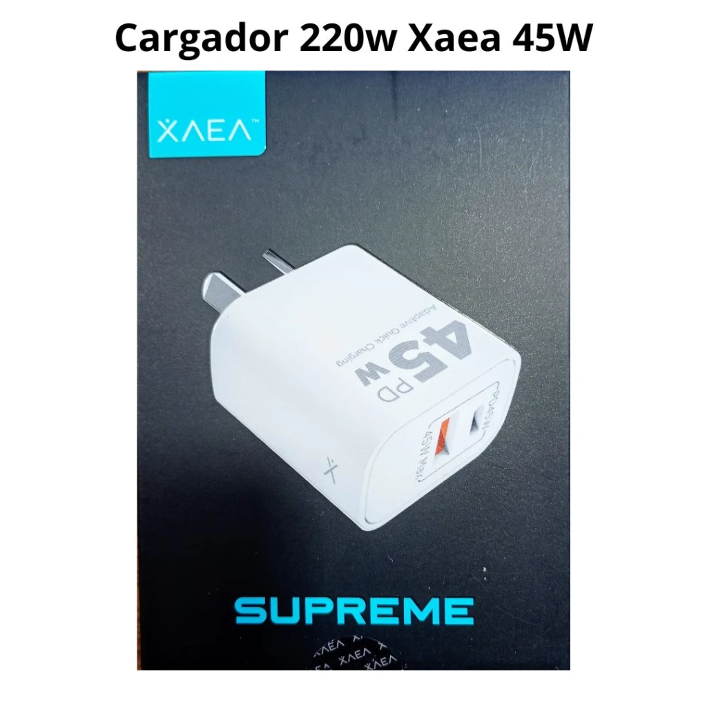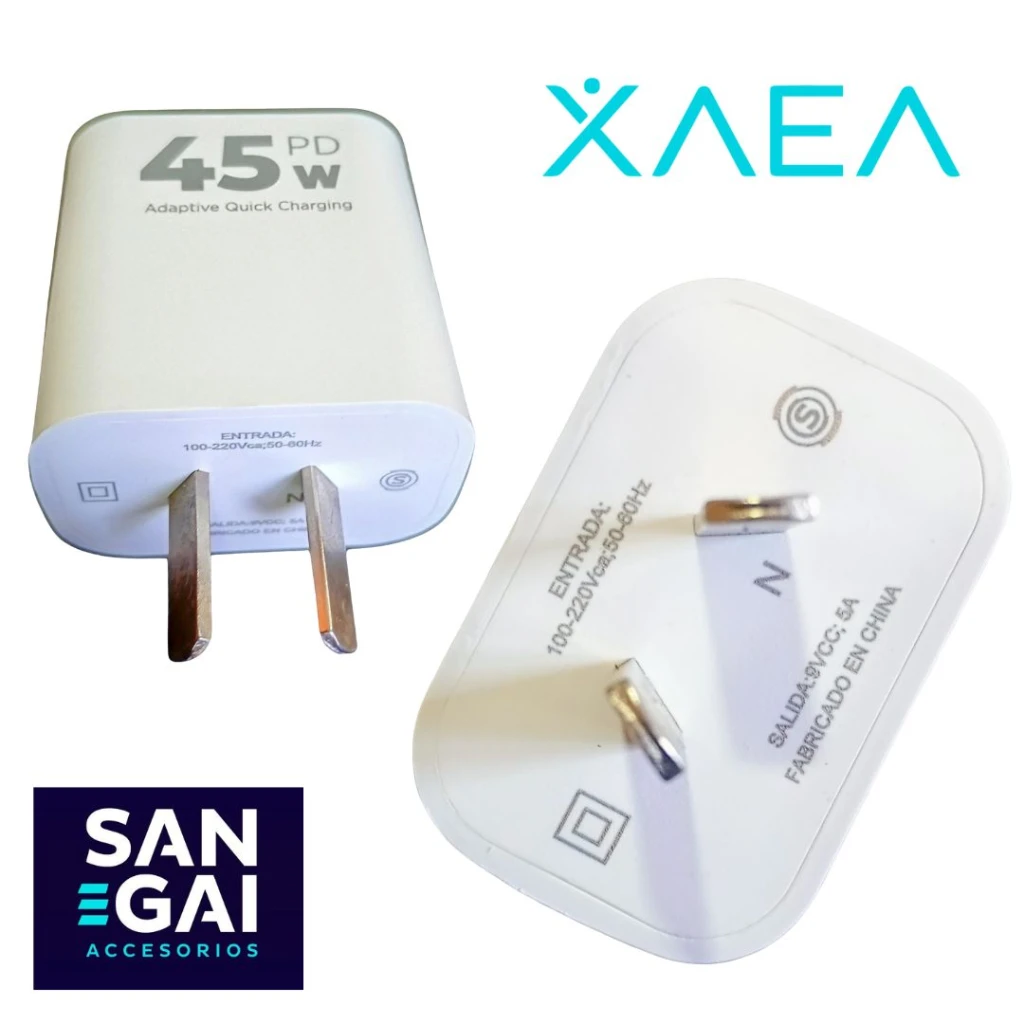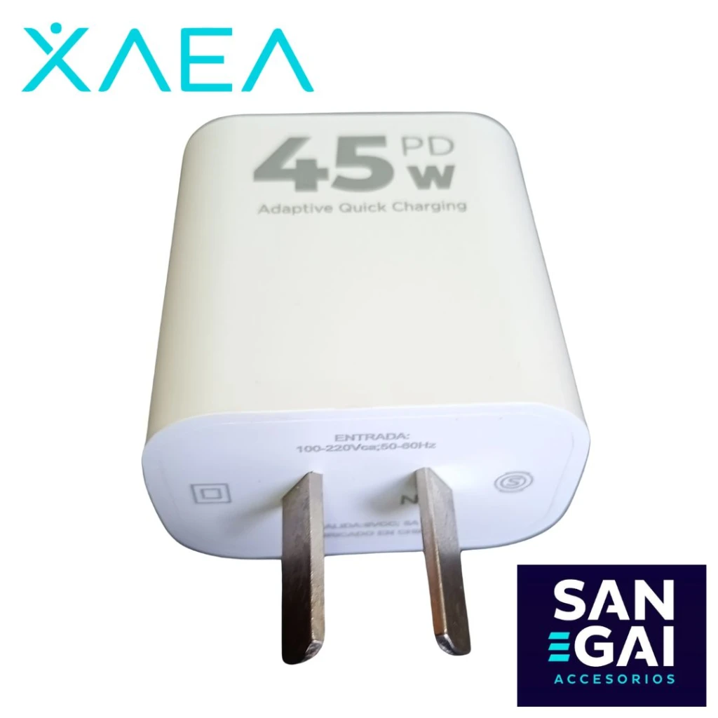 cargador 45wconeccion: usbconeccion: usb-ccarga rapidamarca: XaeaEntrada: 100-220vca, 50- 60Hz mA
